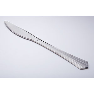 Pretty unassuming isn’t he, with his dull little edges and clean complexion. How can he possibly harm your party? Consider what happens when your guest has to use him though. Immediately the arm’s natural instinct is to bend to its side horizontally at a 90 degree angle and start sawing back and forth. Watch the arm, it will extend sometimes up to six inches to the side while sawing. Further if what it is cutting is hard to get through like steaks or thick dry pieces of chicken. Not only do you need space to accommodate the size of a person’s frame but now you need an extra half a foot to their right or left to prevent elbowing. Otherwise people have to cut in a very ineffective and awkward way.