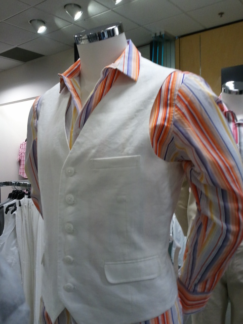 (The reason your brain is reacting the way it is to what Macy’s did here is because their floor team chose to bring out the white in this outfit rather than make the colors work together. The vest just reinforces the fact that this shirt is too busy.)