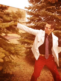 (Red and off white tie bringing it all together while I defend humanity from this vicious Pine Tree’s lurid advances. No mean’s no Pine Tree. Keep your branches to yourself!)