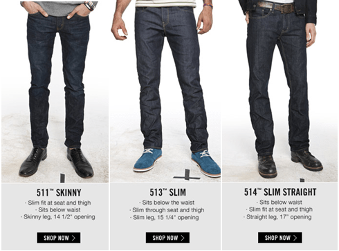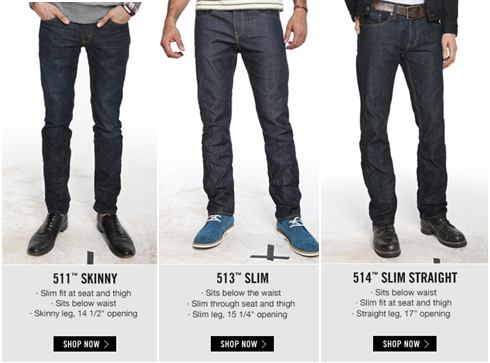 Below, are 3 suggestions with varying degrees of slim-ness. I like Levi’s since they offer great looks for a budget conscious price: