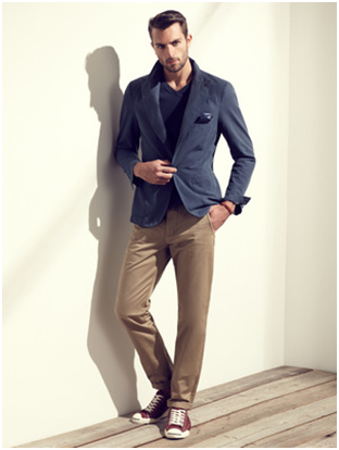 Feel like dressing it up a bit without looking too formal? Wear fitted khakis, and throw on a slim blazer.