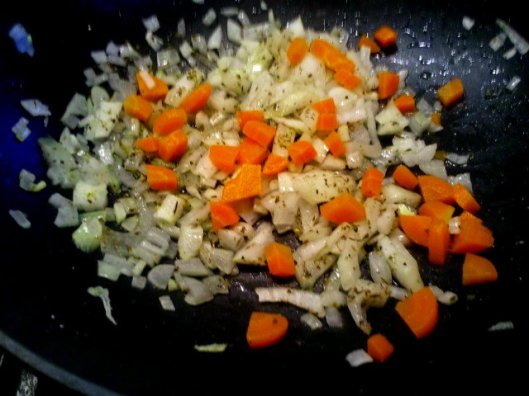 Get your Mirepoix going. Warning, your kitchen will smell like what Super Heaven smells like. Ladies, you could do much worse in our eyes than to smell like simmering onions, celery and carrots.