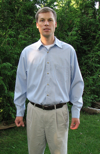 Some of you out there are looking like you’re after a Zoot Suit look. Fit, it’s all about fit. Are you having to put your belt at the last notch to get your pants to stay on? If so, too big. You get an ungly scrunching around the waist when you have to tighten your belt too far.